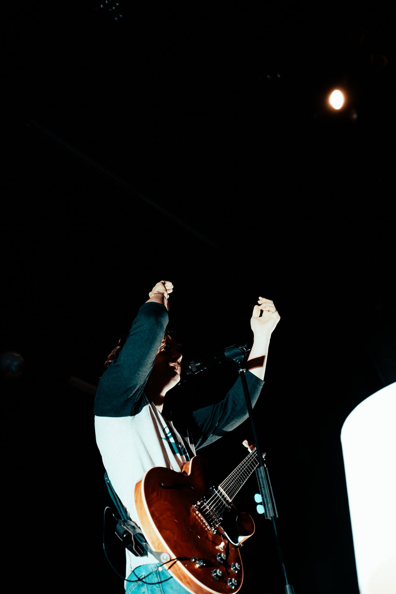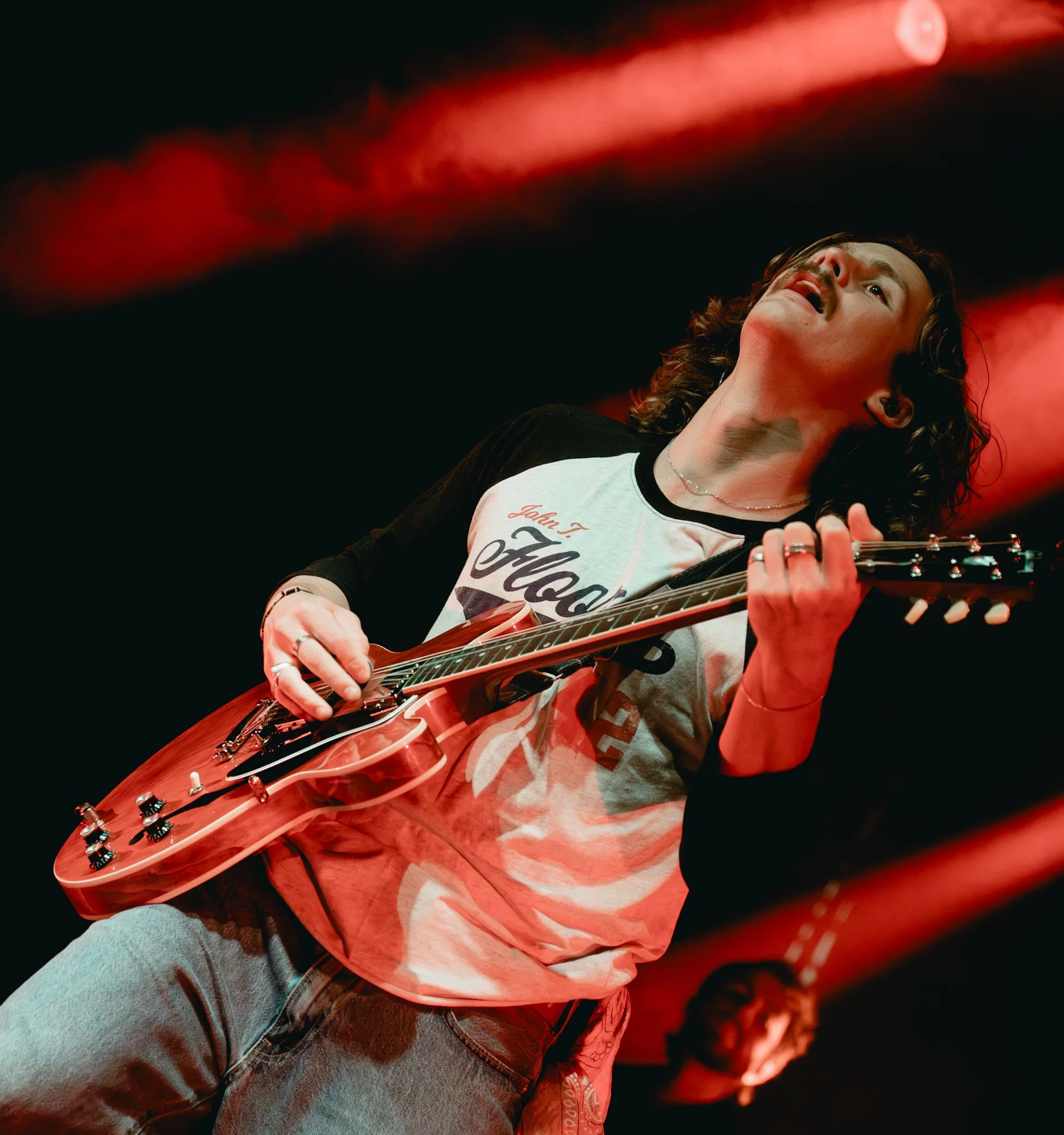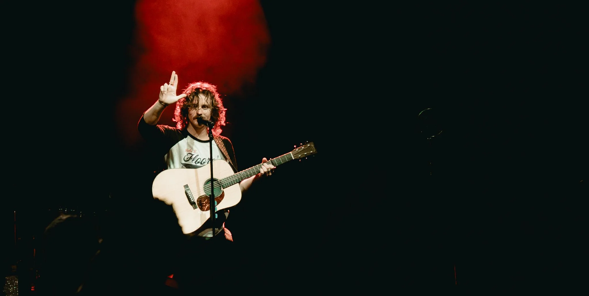 As the lights dimmed, anticipation swept through the theatre. Glowing red letters that spelled out “Evan Honer” illuminated the stage as the first electric guitar notes rang out. Band members filed in one by one. Suddenly, Honer himself appeared in a dramatic aerial entrance that instantly set the tone for the night, marking one of the best entrances I’ve seen.