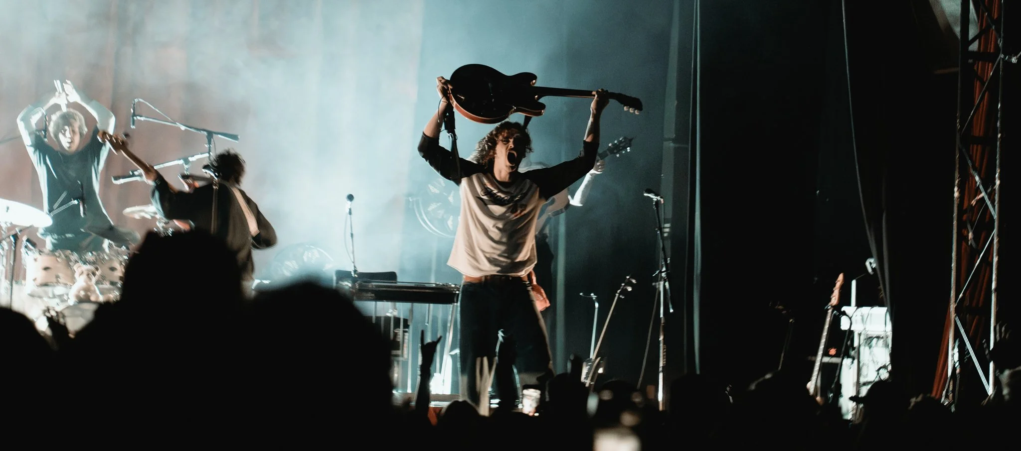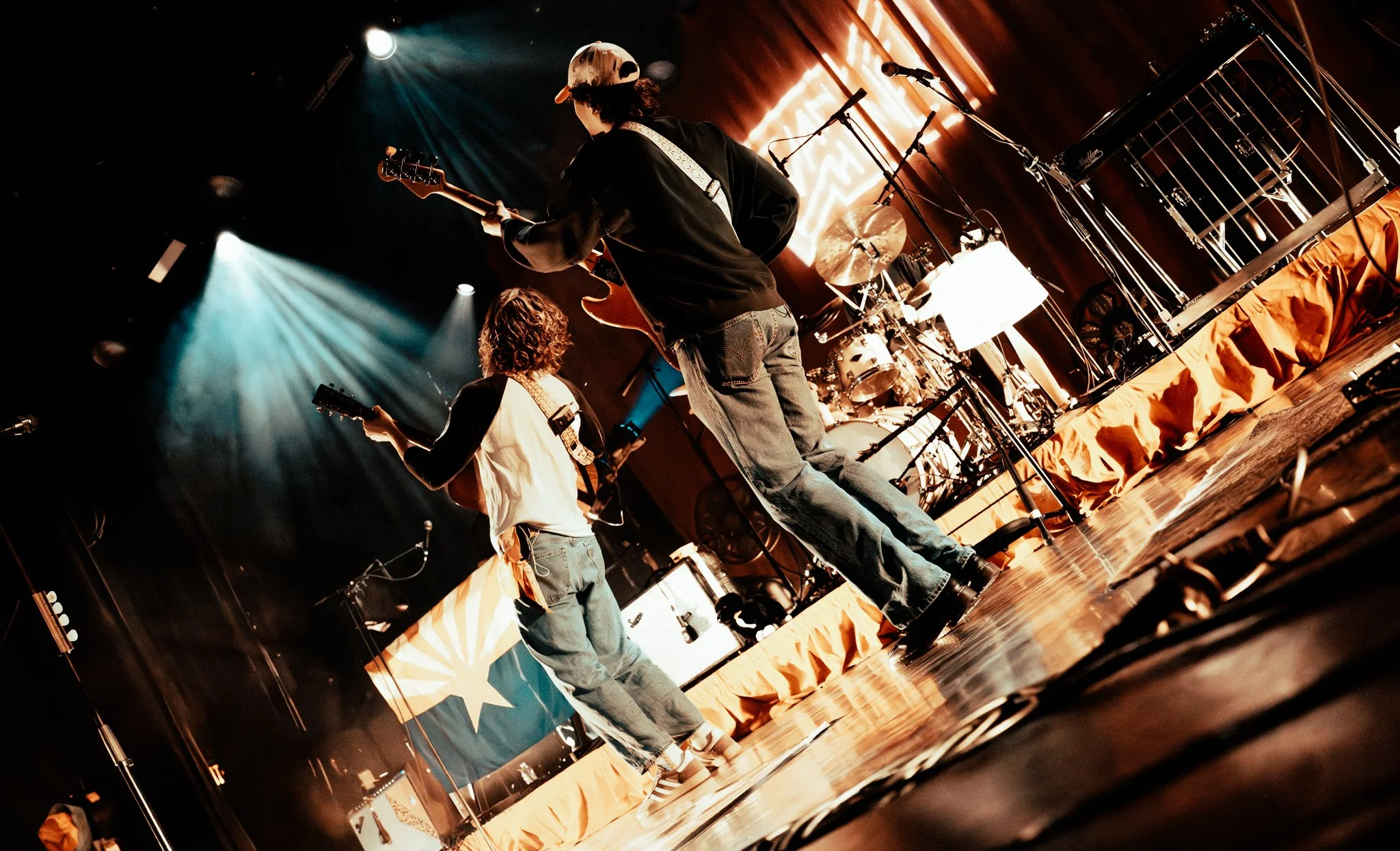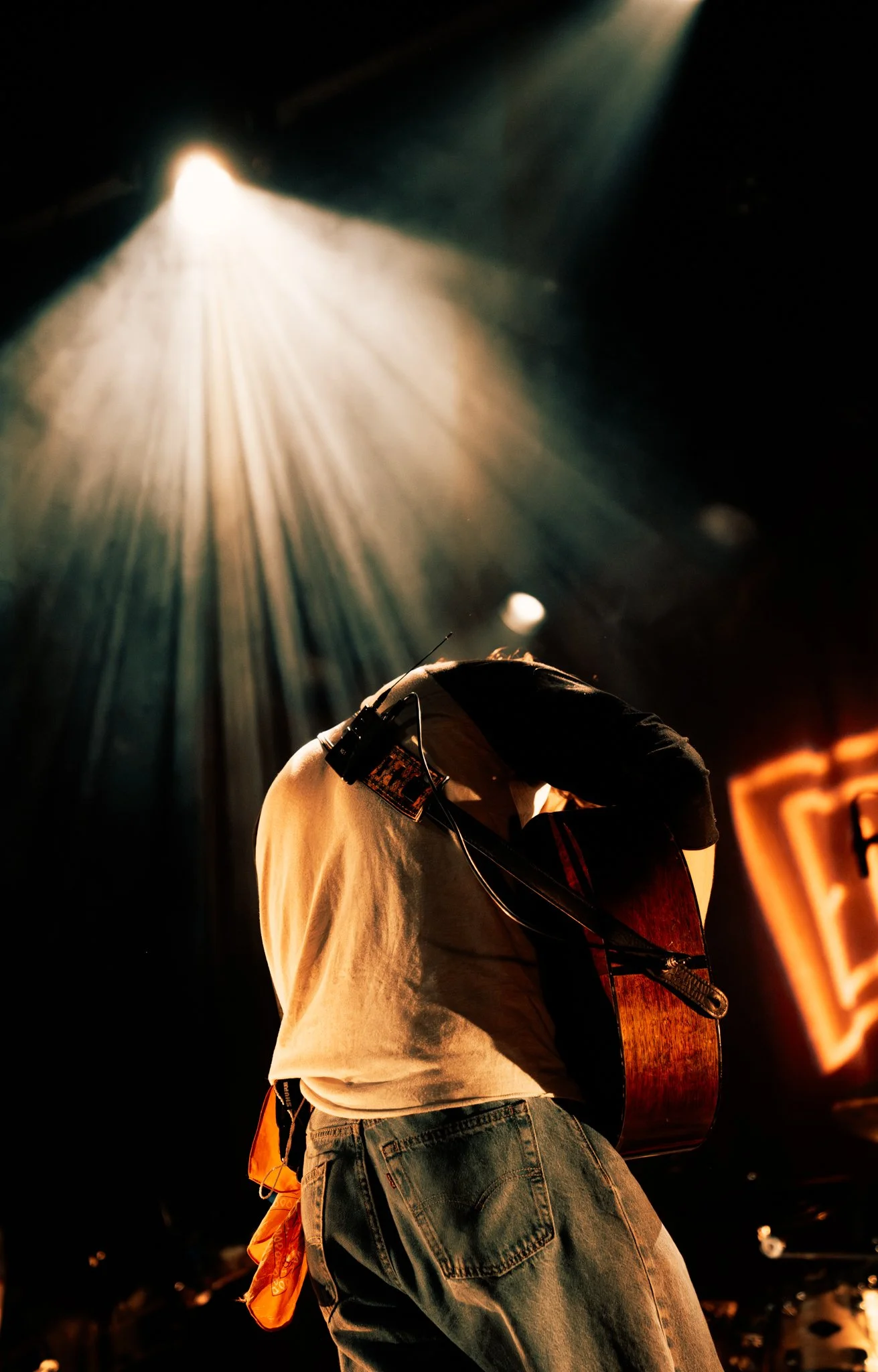 As the lights dimmed, anticipation swept through the theatre. Glowing red letters that spelled out “Evan Honer” illuminated the stage as the first electric guitar notes rang out. Band members filed in one by one. Suddenly, Honer himself appeared in a dramatic aerial entrance that instantly set the tone for the night, marking one of the best entrances I’ve seen.